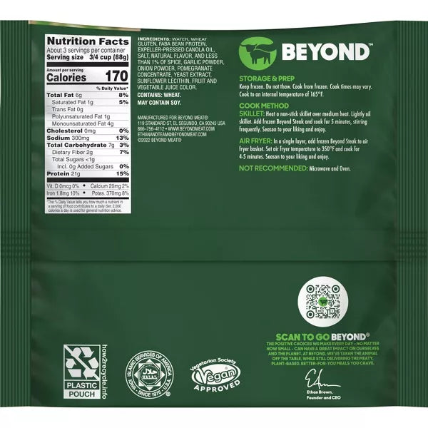 Beyond Steak® is plant-based seared steak tips that are designed to look and taste just like real steak. Made from simple plant-based ingredients, these seared steak tips are not only delicious, but cook in just 5 minutes. Delicious fajitas, stir fries, salads and more just became that much easier with Beyond Steak®.